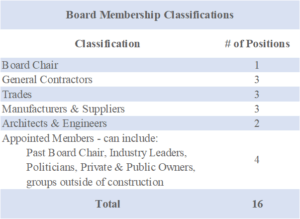 The ECA’s Board of Directors will be comprised of up to 16 Directors, 1 Director Ex-Officio (the Chair of the Board), and up to 4 appointed Board members. Directors represent the Association's 4 Classifications of Membership — General Contractors (3), Trade Contractors (3), Manufacturers & Suppliers (3) and Architects & Engineers (2). Directors are elected for 3-year terms.